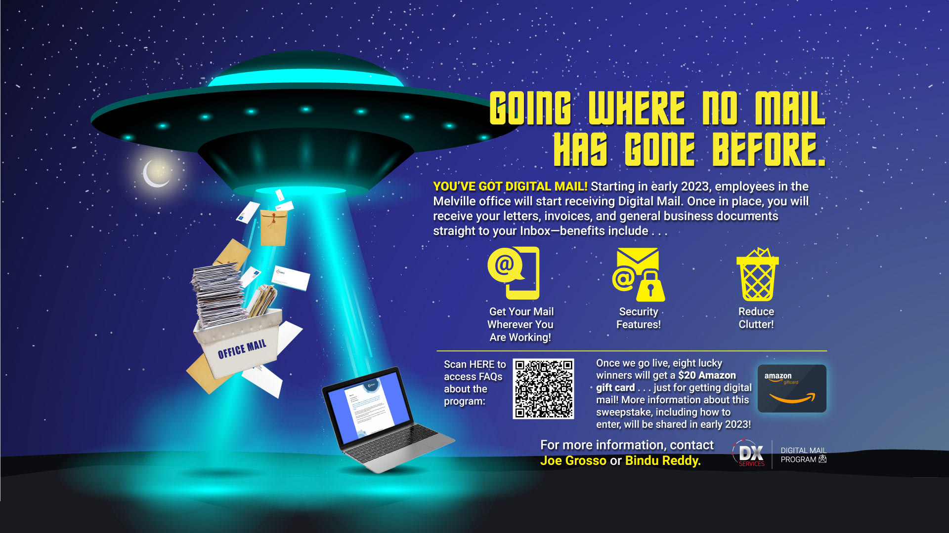 Canon DX (Digitalization Experience) needed a fresh promotion for its paper mail scanning service, one that would stand out and drive adoption by employees. I came up with the slogan first "Going Where No Mail Has Gone Before" and resulting image literally designed itself. The resulting campaign saw an initial 25% acceptance rate, with plans to expand to all HQ by end of 2025.