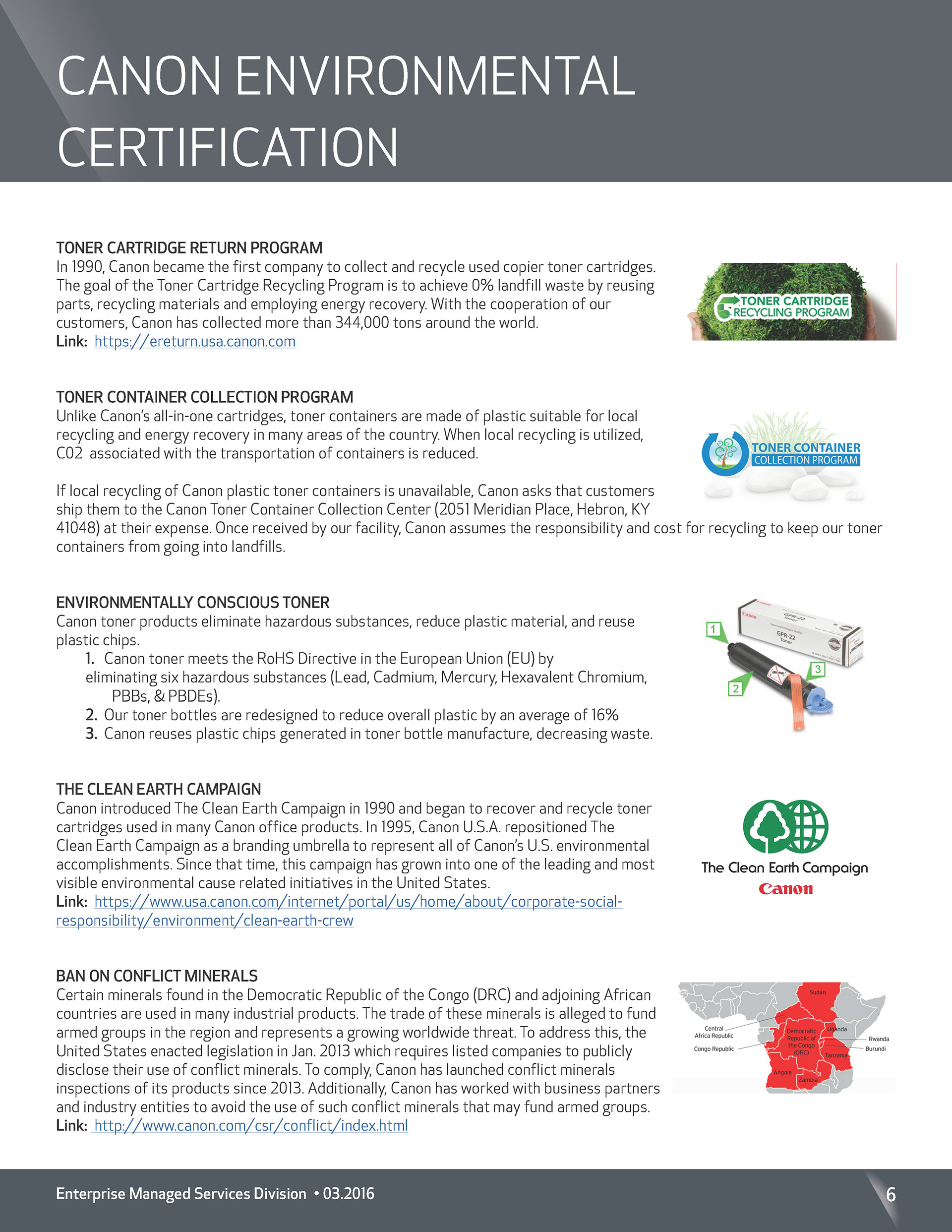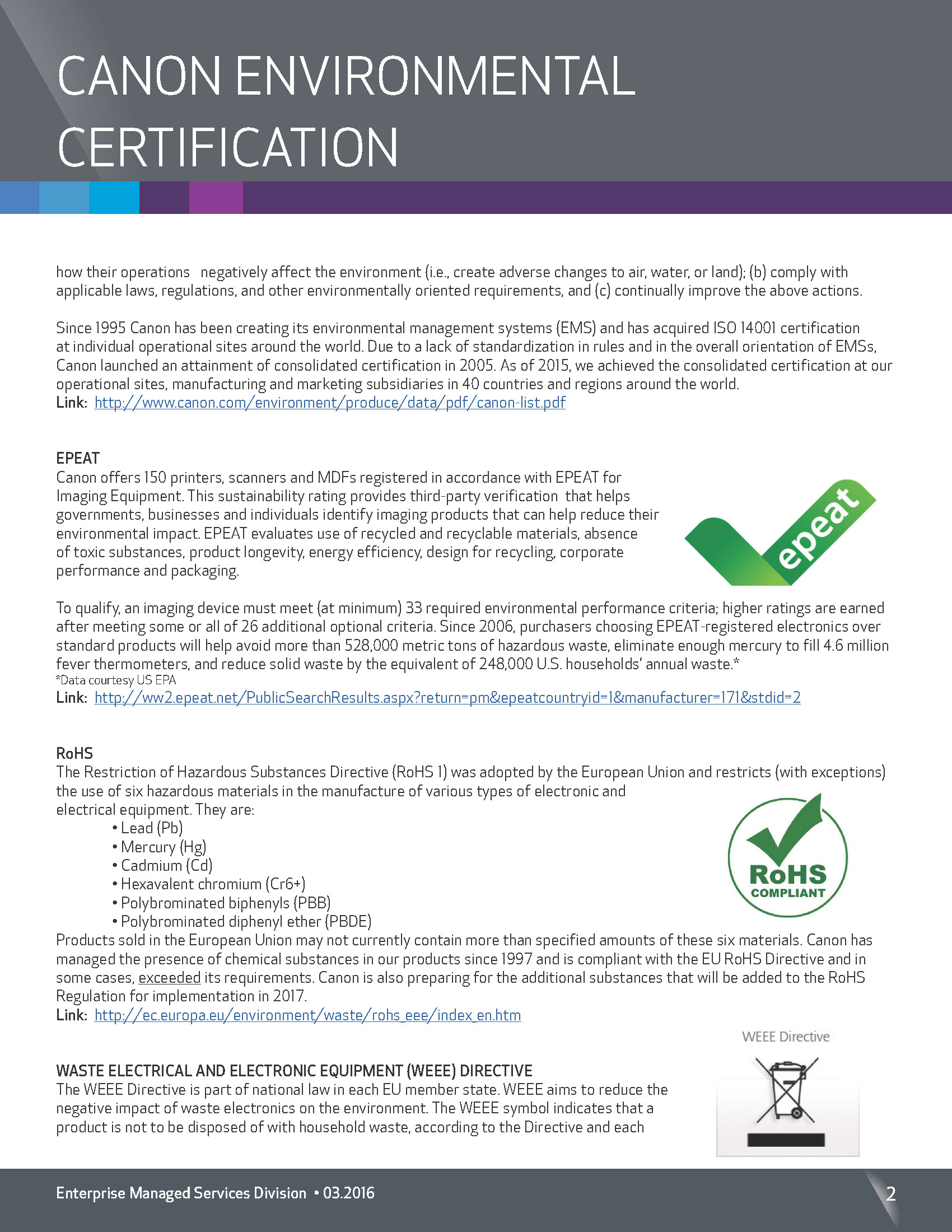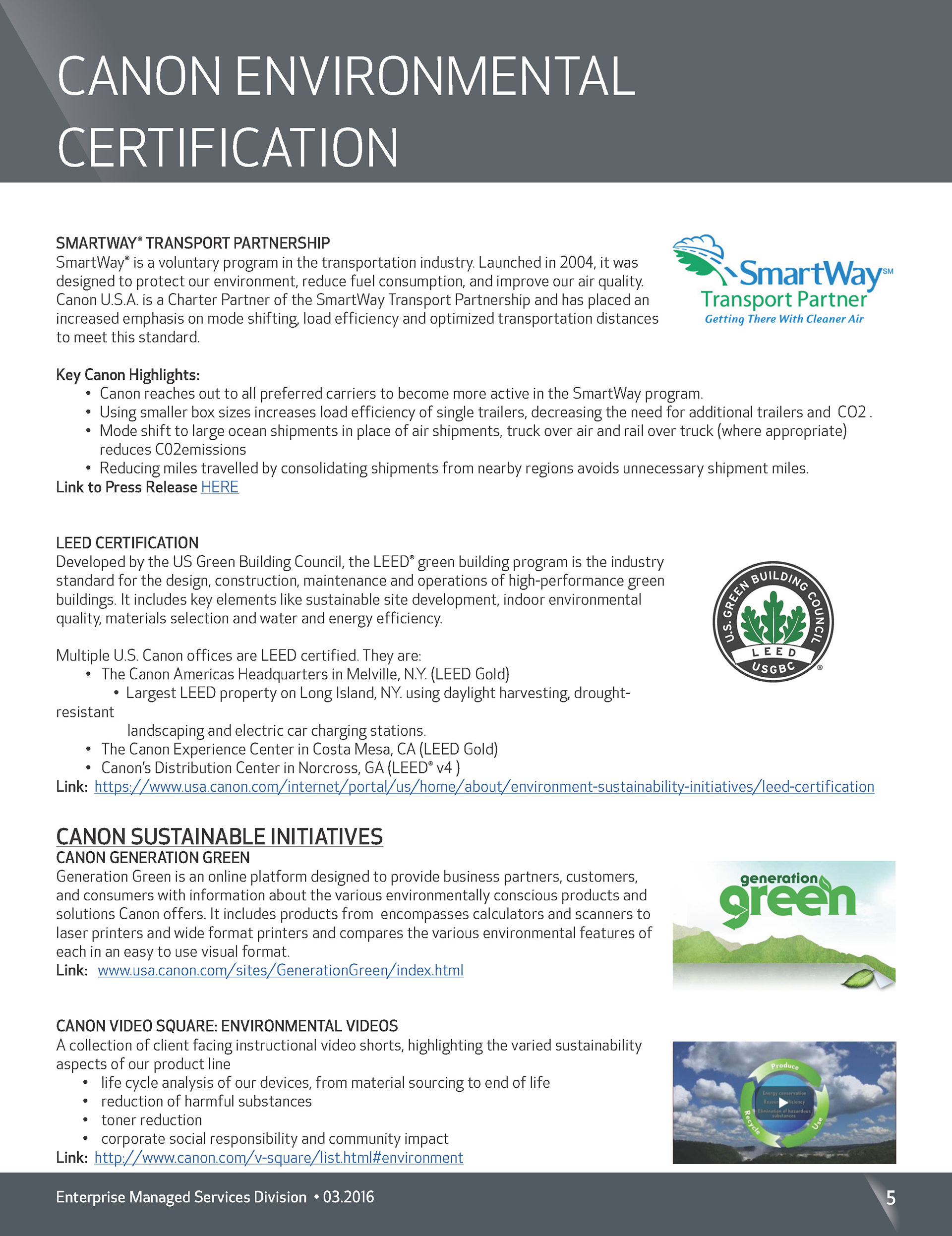 The first is the Environmental Certifications Guide, outlining the national / international requirements the company adheres to (ENERGY STAR®, EPEAT, LEED, ISO 14001, etc.), industry awards for green advances, and the diverse environmental programs it underwrites.