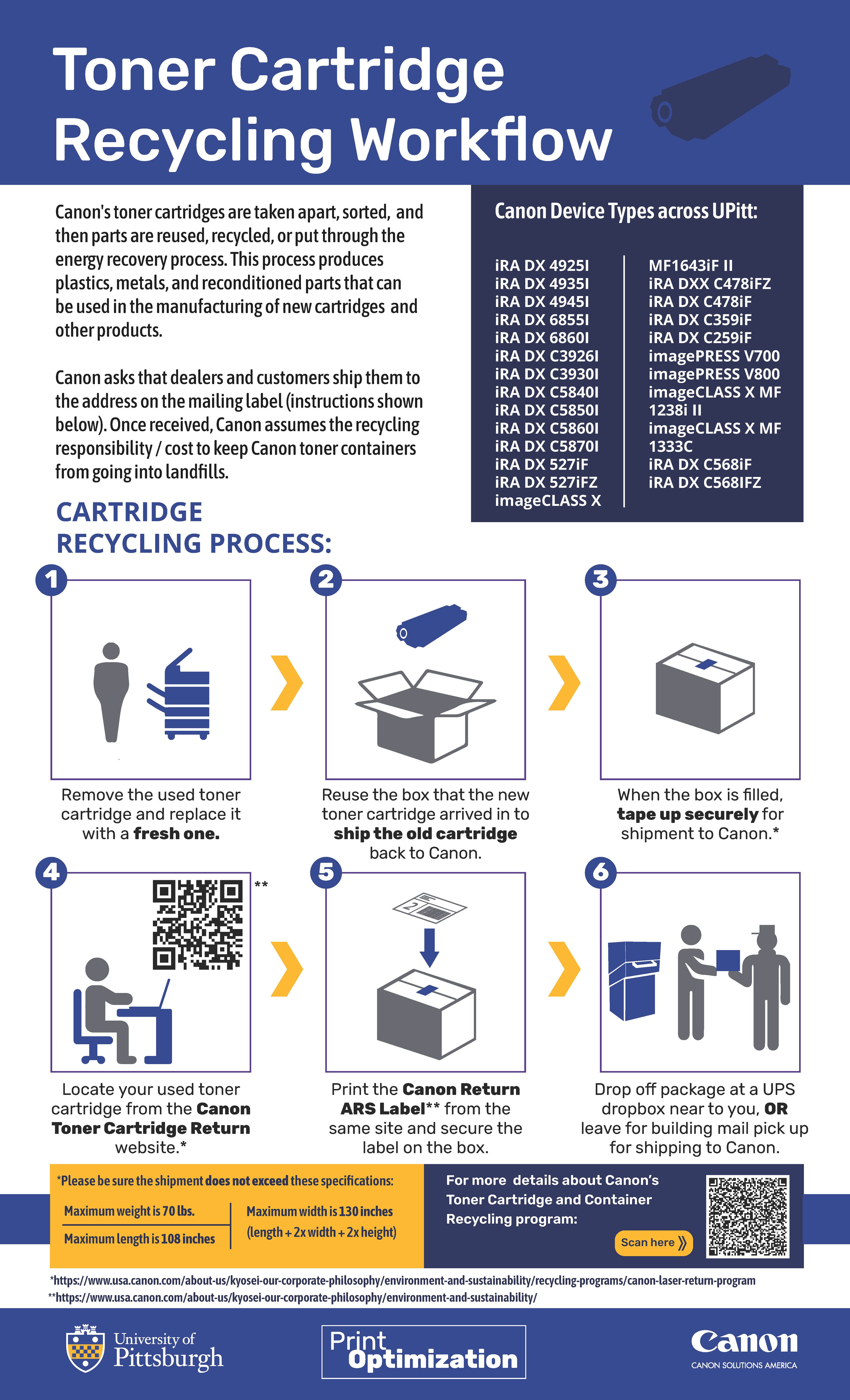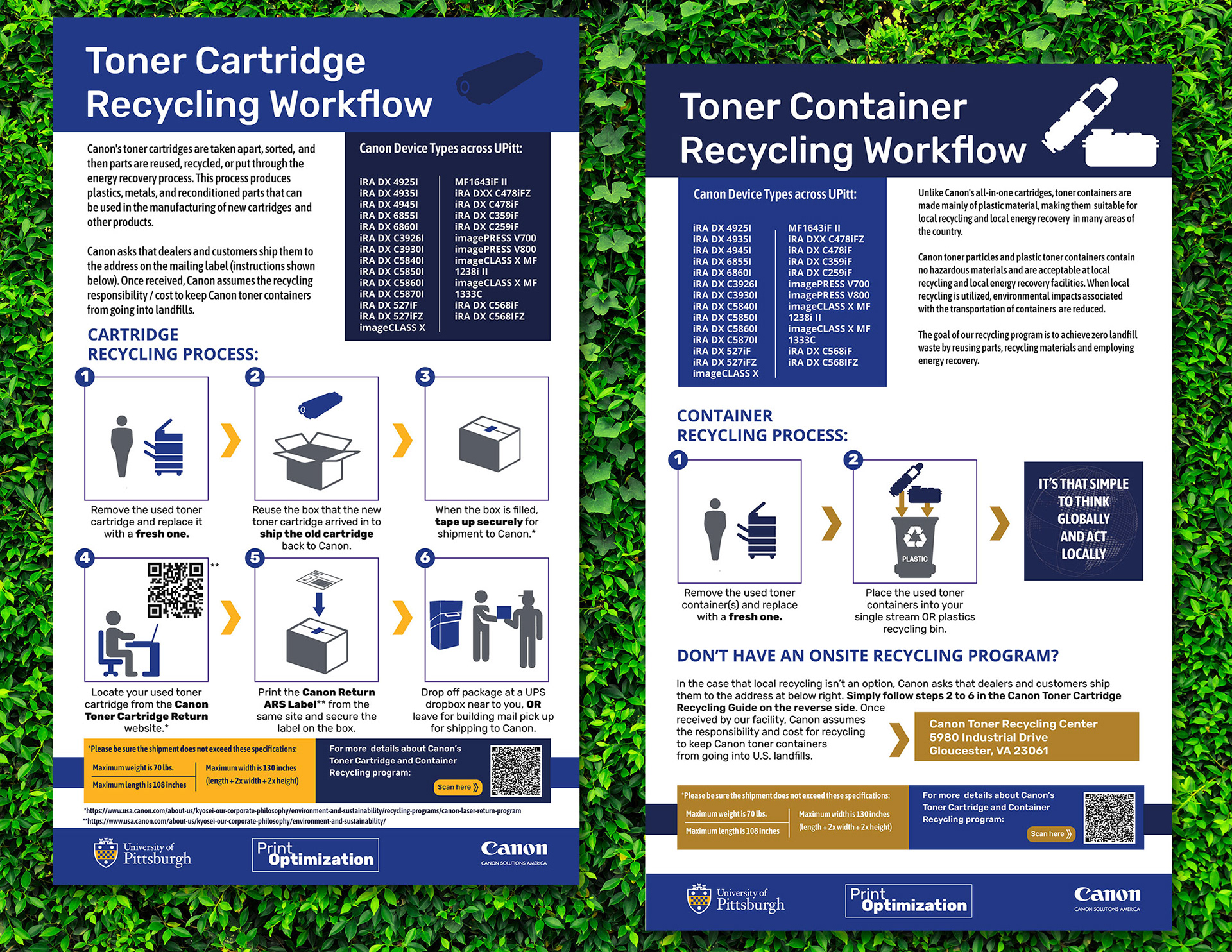To drive greater Canon cartridge recycling at U Pitt (while reducing landfill waste), I created this guide for their facilities team. I researched device types on campus and their recycling processes, designed the layout and graphics in Pitt colors for high recognition, and distributed the final digitally to all business units across the university. Awareness drives beneficial behaviors!